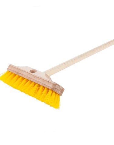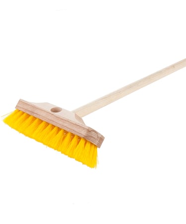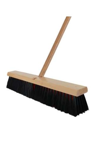 Cepillo inclinado para todo tipo de uso, fabricado con fibras de polipropileno. Base y mango de madera. Recomendable para áreas de limpieza pesada.