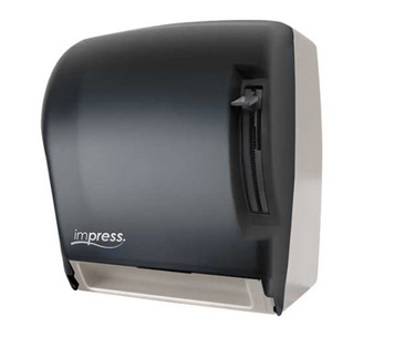 Dispensador de rollo manual de tamaño compacto que ofrece la función de “paradas de palanca” una operación de manos libres para minimizar el desperdicio de papel