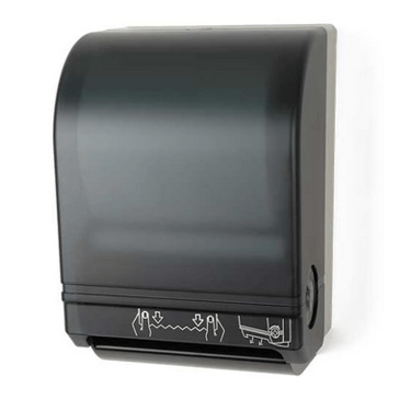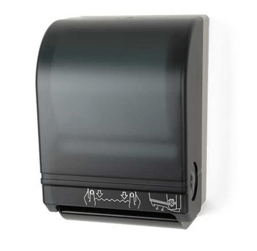 Dispensador de rollo utilizado con marcas universales de papel tejido jumbo su diseño traslucido ayuda a la detección baja de suministro de papel.