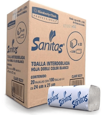 Toalla interdoblada de papel tipo Sanitas, paquete de 20 fajillas con 100 toallas c/u. Útiles para limpieza personal, en el hogar, oficina o negocio. Multiples usos